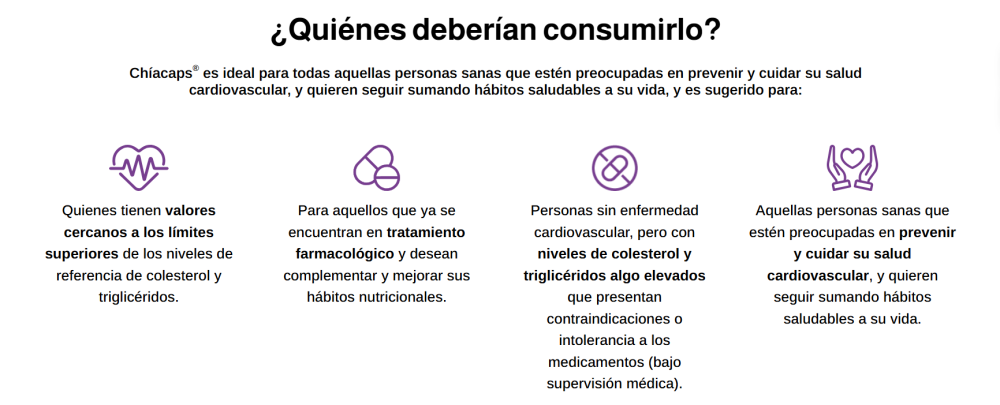 Chiacaps es un suplemento dietario natural, basado en aceite de chía rico en Omega-3 vegetal diseñado para reducir niveles de colesterol y triglicéridos, contribuyendo a la salud cardiovascular. Es una opción de origen vegetal, libre de trastornos digestivos, ideal para el cuidado de arterias y el corazón.